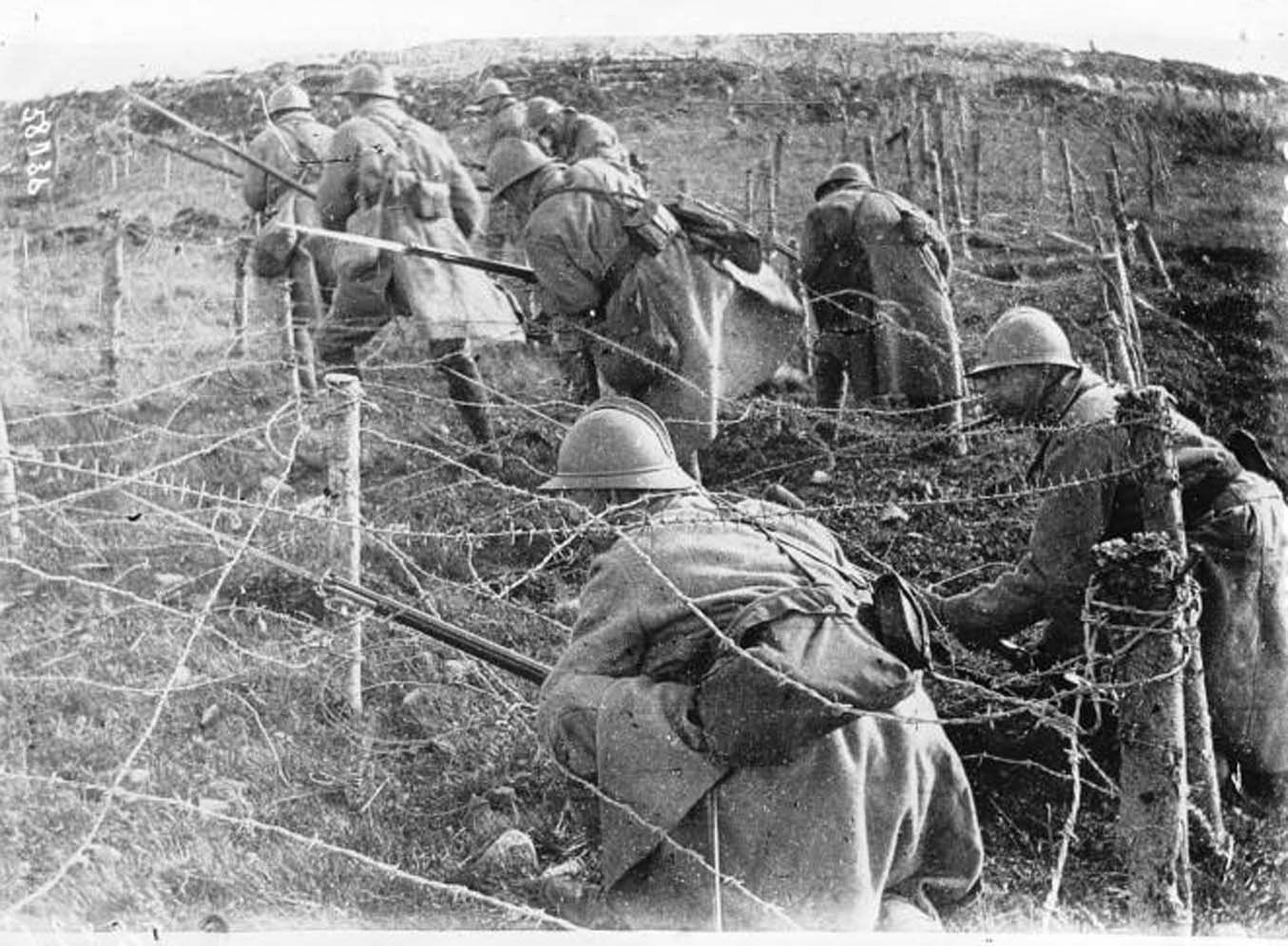 Soldats d'infanterie, munis de masques, traversant les fils de fer barbelés ennemis — Agence Meurisse / Gallica (Bibliothèque nationale de France)