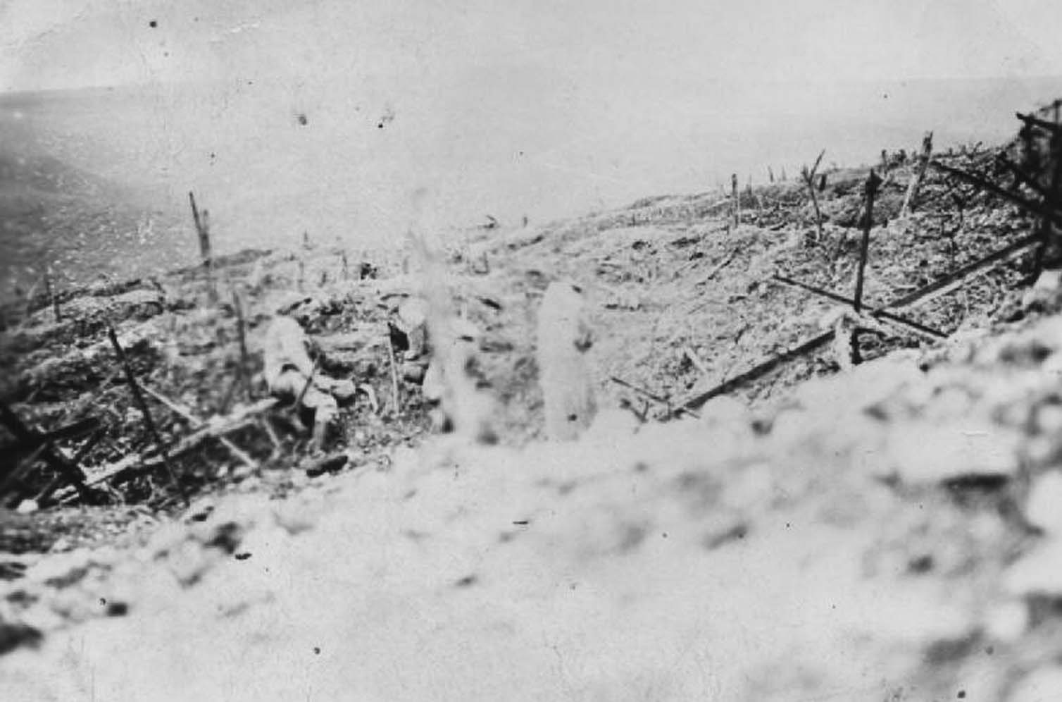 Plus bas, des blessés se plaignent atrocement. L’un d’eux est tombé dans un entonnoir : il se